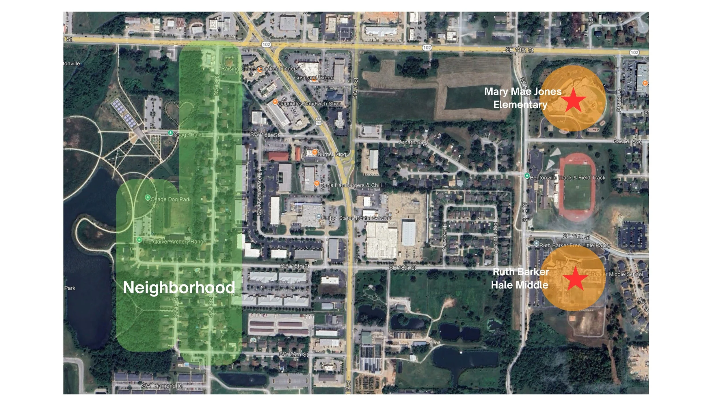 Working together in your group, please explore this area on bike and on foot. Your group will collaborate to develop a concept(s) for a safe and comfortable active transportation connection(s) from this area to existing Bicycle and Pedestrian infrastructure. The goal is to increase bicycle and pedestrian safety and connectivity to the schools from neighborhoods/homes located to the west of HWY 71B/Walton Blvd.