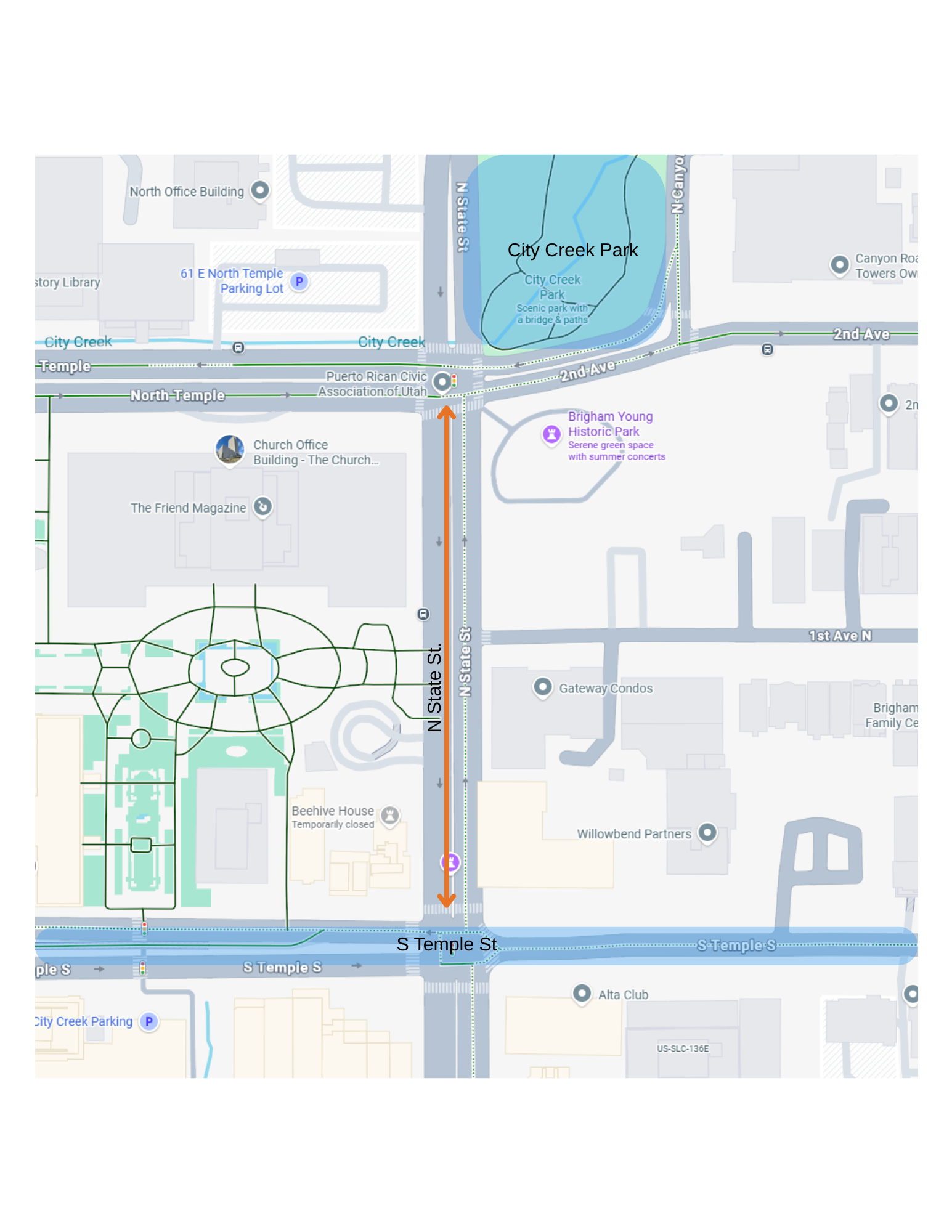 Working together in your group, please explore this area on bike or on foot. Your group will collaborate to develop a concept(s) for a safe and comfortable active transportation connection(s) from this area to existing bicycle and pedestrian infrastructure. The goal is to increase bicycle and pedestrian safety and connectivity from City Creek Park to S Temple on N. State St. During construction of the new temple, have safe detours for active transportation users been installed with signage that is clear? What does the transition at N State St and S Temple S look like for someone on bike or on foot that would like to travel east/west?